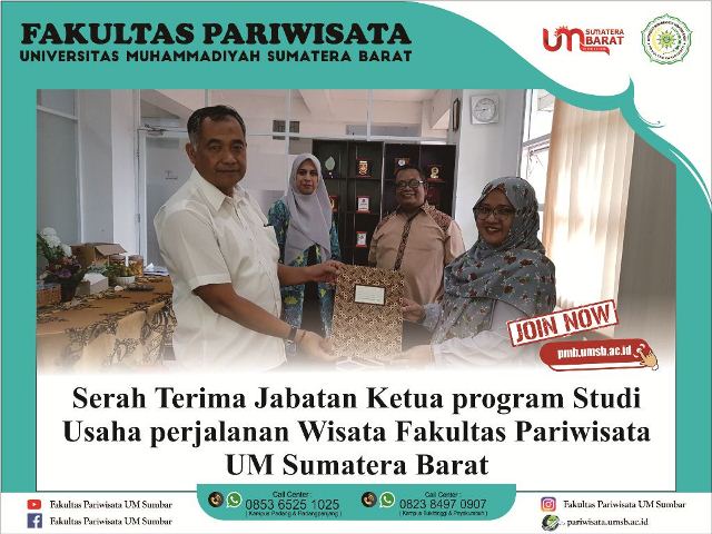 Humas Fakultas Pariwisata UM Sumatera Barat - Senin, 13 Juni 2022 Fakultas Pariwisara UM Sumatera Barat laksanakan serah terima jabatan Ketua Program Studi Usaha Perjalanan Wisata di ruang Dekan Fakultas Pariwisata.