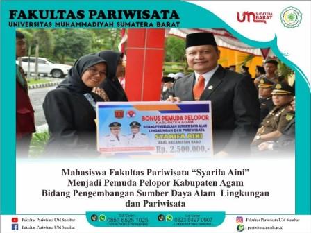 Dengan hasil yang dicapai, Aini mendapatkan bonus Pemuda Pelopor Kabupaten Agam Kecamatan Baso yang langsung diserahkan oleh Wakil Bupati Agam, Bapak Irwan Fikri, SH. Semoga ini menjadi booster bagi Ai dan Pemuda/i lainnya untuk tetap bisa mengabdi di masyarakat dengan ilmu yang didapatkan di Fakultas Pariwisata UM Sumatera Barat.