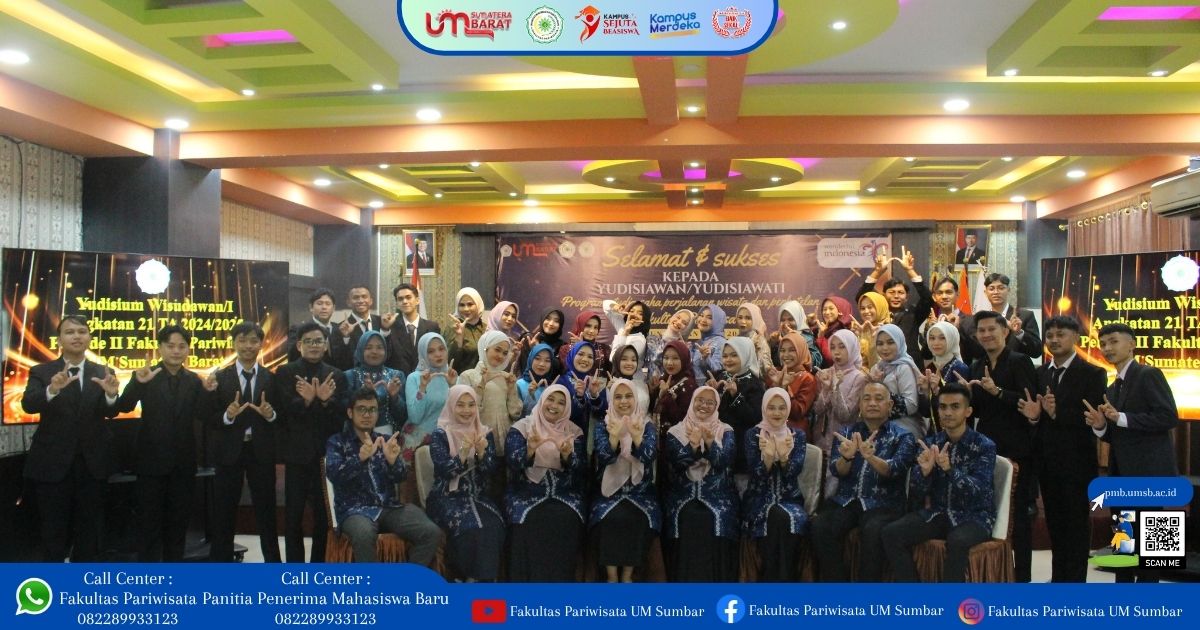 Convention Hall Yunahar Ilyas Kampus III UM Sumatera Barat kembali digunakan untuk acara Yudisium Periode ke II Mahasiswa/i Fakultas Pariwisata UM Sumatera Barat tanggal 14 Oktober 2025, mahasiswa/i yang diyudisium berjumlah total 38 (Tiga Puluh Delapan) orang. 19 orang dari Prodi Usaha Perjalanan Wisata (UPW) dan 19 orang dari Prodi Perhotelan (PHN).